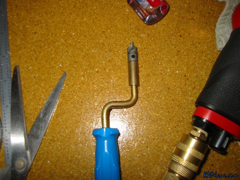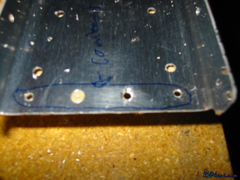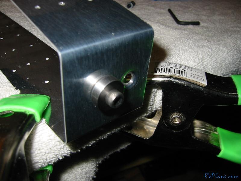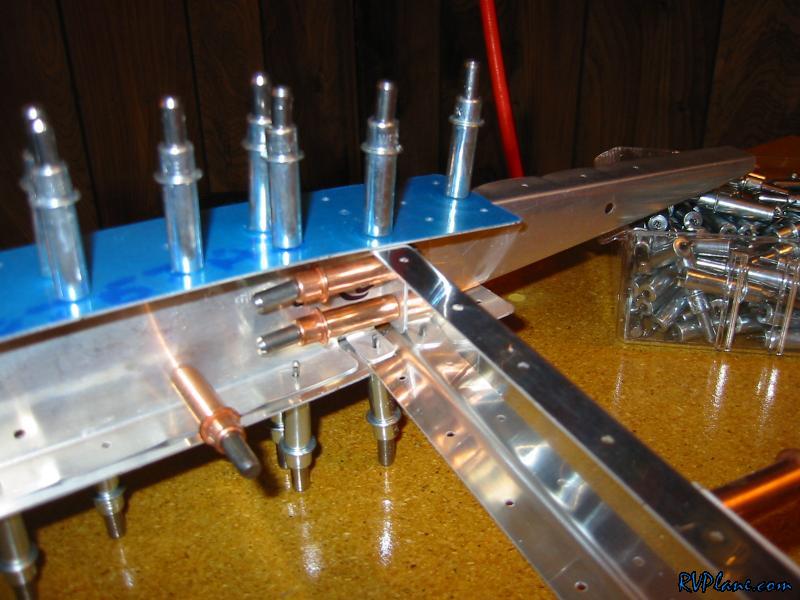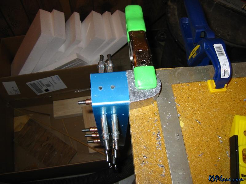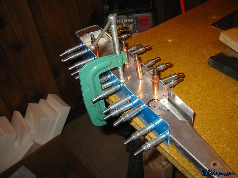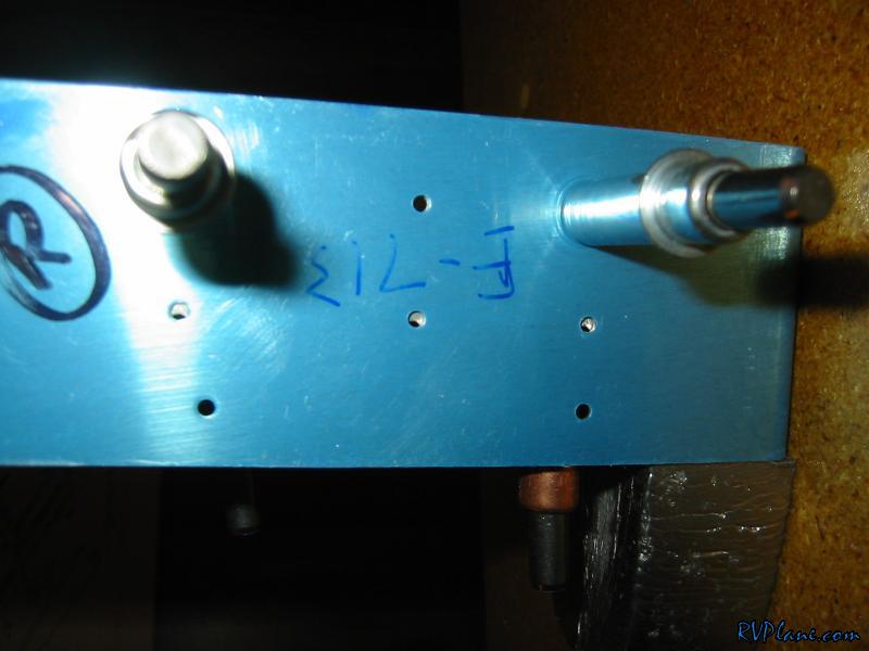 Tonight I got the counterbalance skin clecoed to the two end ribs. This took some work and I needed to rig something up to squeeze the ribs together tight to get some clecos in. I suppored the bottom of one rib with some scrap wood and then used a clamp to compress the ribs. It worked rather well. I did this for both the left and right side. Now comes drilling the counterweights with a #12 bit. This is more or less of a blind process. I was scared to death that I was going to end up with some holes too close to ribs/edges. Everything looked good when I was done. I took my time drilling and made sure that everything was straight. One of the holes might be maybe 1/64" or so too close to the rib. I might need to shave down the corner of a washer a hair or so.... Hindsight being 20/20, I would of definitely done this in a drill press. There is just too much that could go wrong here that could ruin a perfectly good day. I consider myself lucky!!! Next I clecoed the counterbalance ends to the spars. Once everything was together, the alignment on everything got better. I don't know why, but all my allignment concerns went away. I drilled the inner rib #40 holes. Then the skin went on, finally the horn brace went on. Match drilled everything. Next I took the skin off and dimpled the #10 screw holes (#12 drill holes) with the Avery #10 screw dimpler. Next countersunk the counterweight. I made a template to check my countersinking depth. I went ahead and did the left countersink while I had the countersink set. Finally, I countersunk the inner spar where it attached to the inner rib with a #40 rivet. The inner holes are easy to get to. The outer two interfere with the countersink cage. I ended up putting the countersink bits into the swivel deburring tool and that worked great. It was slow enough to work at a comfortable pace, but fast enough to give a good looking face to the countersink. One thing I noticed on my trailing edge of my right skin was some slight buldges where the stiffeners might of squeezed into the skin. When I put a ruler over them, the ruler didn't even find them, but they reflect in the light of my shop. I called Van's up about this too, and Scott said it wasn't anything to sweat about. I was able to push some of them down a little with my fingers. Man, my next RV is going to turn out so much better knowing what I do now! This is how screwed up some of the holes are in the countersink skins. I used this clamp to squeeze everything together. Before you gasp at how bad this setup is, I had a bunch of plywood shims between the lower rib and the table. The end result put NO MARKS IN THE RIBS. Next I drilled the holes for the counterweight. I used plenty of BoeLube to lubricate this drilling process. Finished product. I put the ruler on the edge of the counterweight to level everything out. With it sitting on the bench by itself, it was about 5-10 degrees off. End clecoed to the spar. Everything lined up nicely. skeleton connected to the skin. All the holes lined up for some strange reason. the #10 screw dimpler in action. The counterbalance weight countersunk. Try saying that 10 times. The inner two holes countersunk. The outer two are going to be a little harder. WAIT! The countersink bits fit into this deburring tool. GIDDY UP!