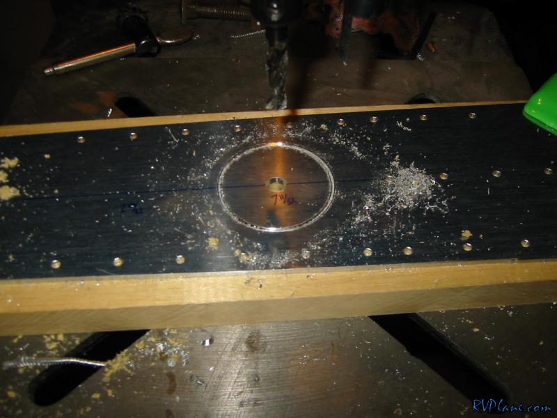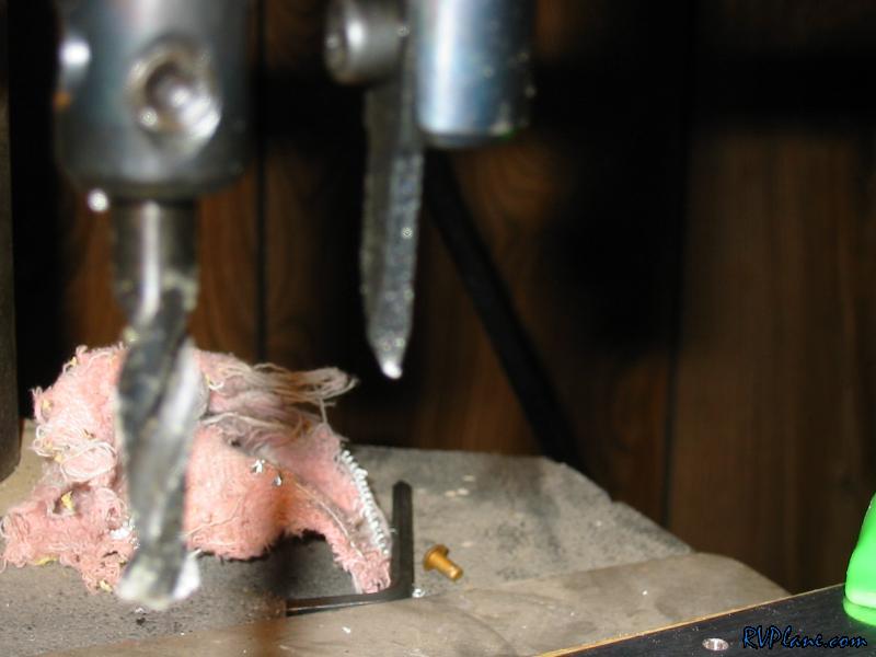 I went to both Home Depot and Lowes today and neither of them had the fly cutter. When I got home, I decided that I couldn't do much harm with the one I got from Harbor Freight. The thing started nicely, but quickly dulled. I only got about 1/32's though the doubles before I gave up. I looked around online to where these things can be got and it turns out that the sears by my work has them in stock. I am not going to touch the setup I have tonight for fear that I might throw it off a little. I will pick one up tomorrow on the way home. This is how far I got on the lower hole with the HBF cutter. The blade dulled right away. This is a close-up of the blade. It pretty much just caved in on itself.
