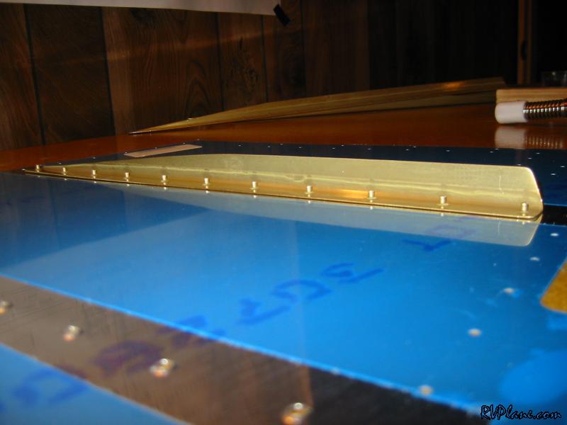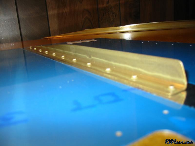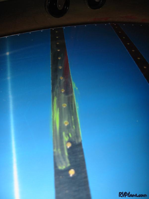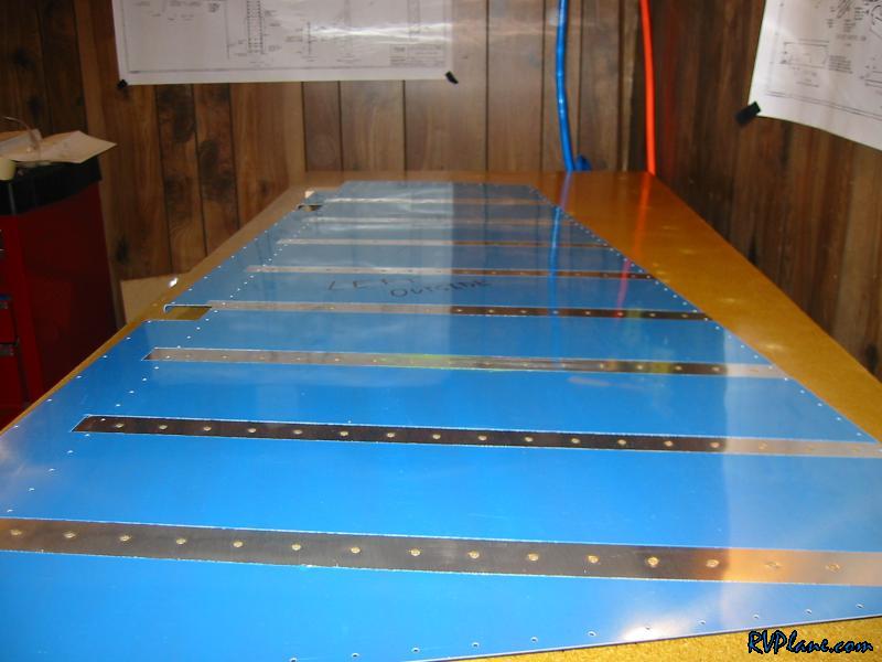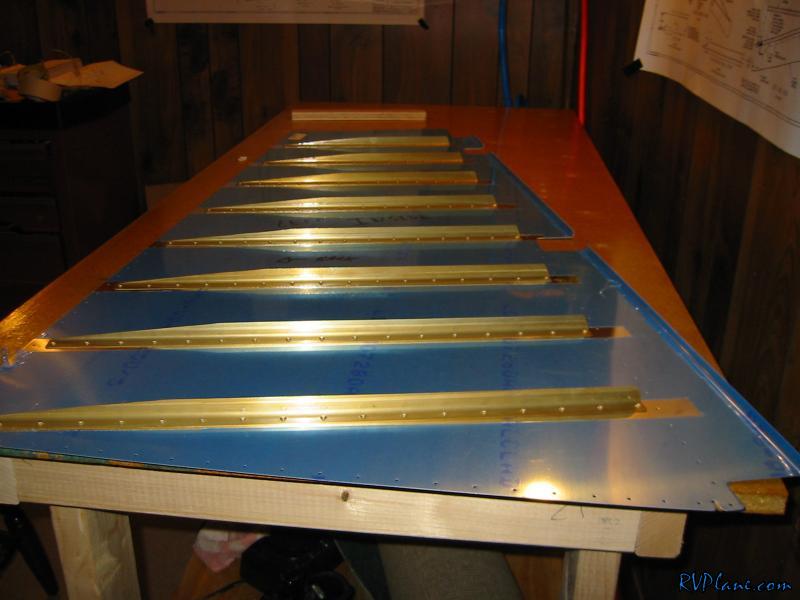 Tonight I learned the joy of back riveting. I didn't have much time to work on the project, but I did manage to get all of the stiffeners back-riveted to the left skin. This was cake. I can see now why people say that even monkeys can back rivet. I started out by doing one row of rivets, one row of tape. Then two rows, then 5 rows, then the last row. It didn't occur to me until I finished that I should just tape all of them to not only speed up the process, but the tape will act to protect the alclad on the outside of the skin while the skin is being slid on the table. Man, I think I will only just show people my RV from the right side. All of my f-ups have been on the left side. One thing that I will complain about is the rivet tape that is included with the Avery toolkit. It is manufactured by Scotch and has a green tracks on either edge and is clear in the middle. Now, it goes on all fine and dandy and holds up well to the riveting process, but if you yank it off too much, part of the green sticks to the skin. I tried alcohol at first but that didn't even make it budge. Next I tried lacquer thinner on the smaller spot and that picked it right off. I went for a larger spot and I was rubbing it a little more intensly until I saw small little scratches in the alclad! DOH! I do not know how the geniuses at scotch can make a tape that doesn't come completely off if you pull it a little fast. I also do not know why it can't all be clear. If someone out there knows the answer to this, please let me know. I just don't get it. I am going to do what Tom Emery suggested and buy some removable magic tape for the rest of the plane. We used it in his class and it worked really well. The first stiffener before riveting And a blury shot of the same stiffener after riveting. The outside portion of the left skin...it sure it as smooth as a baby's butt, and easy. With most things in life, the harder you work, the better your payout is. Well, that doesn't go for riveting. Shooting and bucking = most work and least attractive results. Squeezing = some work, OK results. Back riveting = no work, great results. Inside shot of the stiffeners. Before I put on the stiffeners. I made sure all of them were flat on the part that attaches to the skin. A few of them needed to be bent/twisted a little to be perfect. This is what the rivet tape green looks like after lacquer thinner hits it. I stopped here for the night. I will come back to this another day.