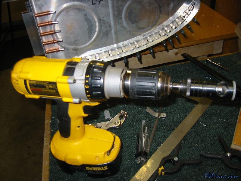 Tonight I started with match drilling the tank skin to the ribs and baffle. Once that was done, it was time to remove the vinyl where the baffle holes needed to be countersunk. I took a tip I read from on the VAF forums and bought a butane soldering iron from Radio Shack to replace the 35 (or 45) watt iron I have been using. This is one of the best things I have spent money on yet. The soldering iron took a while to heat up, the cord got in the way, and you needed to go very slow with it - 2-3 seconds / inch. This butane iron is totally portable (cordless), very light, comes with its own built in stand and is way hotter than the other iron. With a setting a little higher than medium, I was able to move the iron at about 1-2 inches per second. And when I went to remove the vinyl, it ripped perfectly on the scored line. Next I finally broke down and used the cordless drill (DeWalt 18V hammer drill) to countersink the skin-baffle holes with. This was another good move on my behalf tonight. Very consistent countersinks with no chatter. Next I did a reverse mirror trace of the right angle attatchment to the uncut stock. And I was able to get an initial cut before I called it a night.
