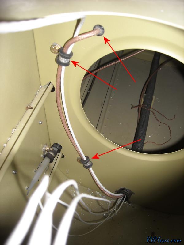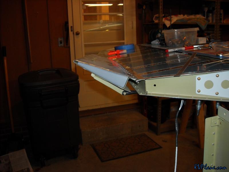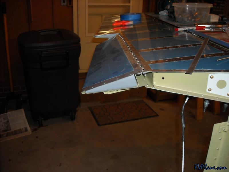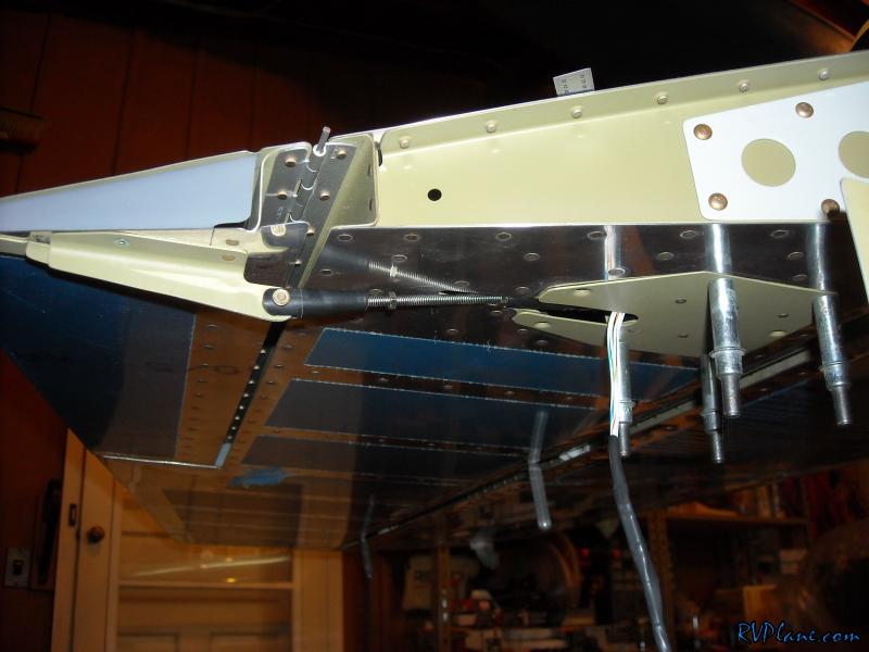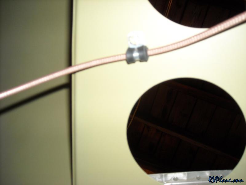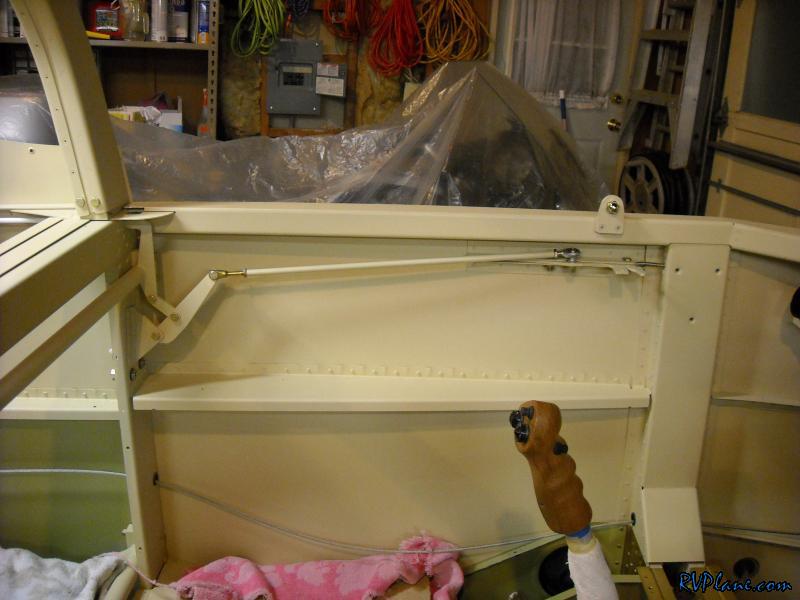 Another great night in the shop. I felt like total crap today at work with my cold, but when I got home I felt a lot better. In no time the garage heater was warming up and my mind was 100% RV. One of tonights goals was to get working on the elevator servo which controls the trim tab. I needed to extend the short wires that come with it. I remember Dan Checkoway putting DB crimp male and female connectors on the servo and extension wires and then shink wrapping them all. Genius! That is exactly what I did. Here is the end product. All of the individual wires are shrink wrapped, then a piece over the entire bundle. Super Secure. I cracked off the empennage fairing tonight. It wasn't stuck all that bad to the empannage, but enough so it made a nice CRACK sound when it came off. I am going to call that precision. The sides were a little flimsy, and thats because of how I bonded the old and new together. To fix this I installed some flox on the gap between the new fiberglass and the old fairing. Once this dries it should be ROCK solid. With my work inside completed (I did the fiberglass stuff in the basement -- no need to get cold) the garage was warm enough to work in. I installed the canopy latch system. Went in pretty easy and the cotter pins weren't that bad to install. All I need to do to finish this is paint the yellow handle that comes from Van's gloss black. I guess I *should& of done that tonight but I forgot. I turned my attention back to the elevator trim. I installed the left elevator and the trim tab, and inserted the servo. I needed to trim down the connecting rod to make everything fit. This is the neutral position. Full up (trim DOWN). and full down (TRIM UP). Next was to finish wiring the trim servo. Only problem is the wire for this is on the bottom of the fuse. I used two adel clamps to secure it to this bulkhead (I forget the nulkhead #). I like adel clamps instead of the nylon sticky clamps for places that go around surface control rods because they are mechanically attached. If I used sticky pads instead, that could come undone and rub the elevator pushrod. Perhaps it could be bad. All of these were particularly difficuly to do because of the limited space in here. I routed the ELT Coax line up here too because I am planning on putting the ELT antenna under the empannage fairing. The ELT antenna wire was secured and ran forward here. A worthless shot of the bottom of the above pic. Finally I installed a sticky pad on the underneath of the read deck for the trim wire. I don't mind using these pads here, because if this fails it won't interfere with any controls. GREAT NIGHT!!!