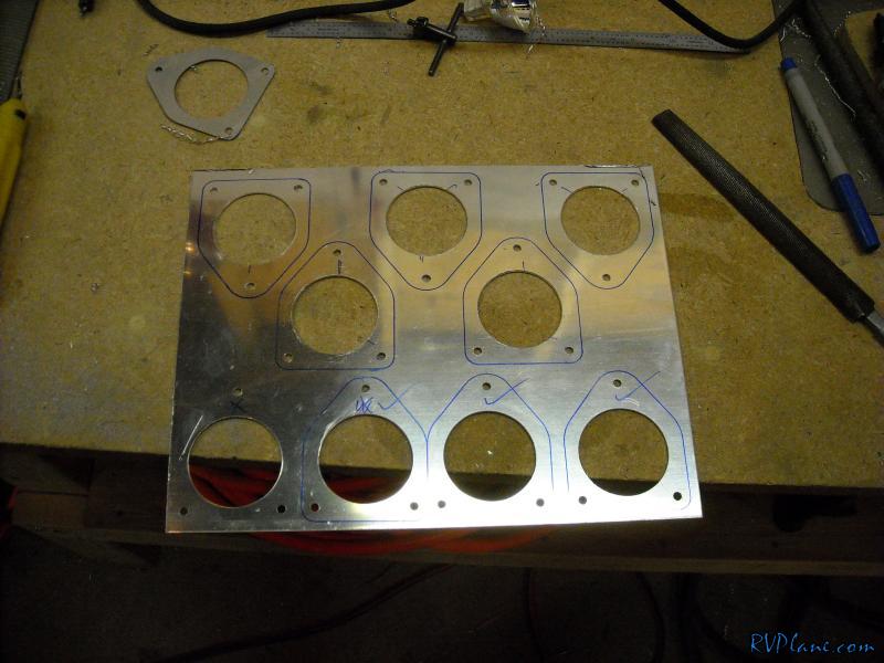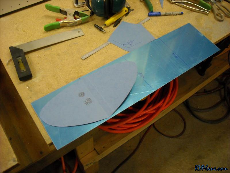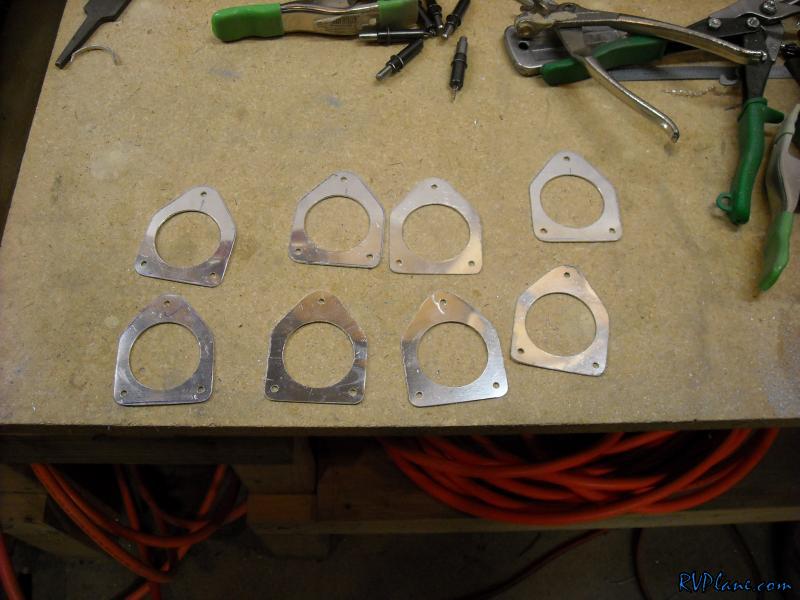 For my landing and taxi lights I am installing two 50W HID lights in each wingtip. The lights are in a 2" MR16 profile which I need to make a bracket to contain the lights. I bought a SafeAir1 kit for mounting these, but it was only for one pair. Since I had two pair, I decided to use the kit as just a template. Using what came with the kit I made 8 mounting brackets (2 per light) out of some 050. After some cutting, sanding and edge finishing, I had 8 brackets. Next I made a template out of an old file folder for making an aluminum backing plate for the wingtips. Using the template I found some 032 scrap that was the perfect size to bend to install in the wingtip. I will take this to work tomorrow and bend it on the bending brake to get a nice bend radius.